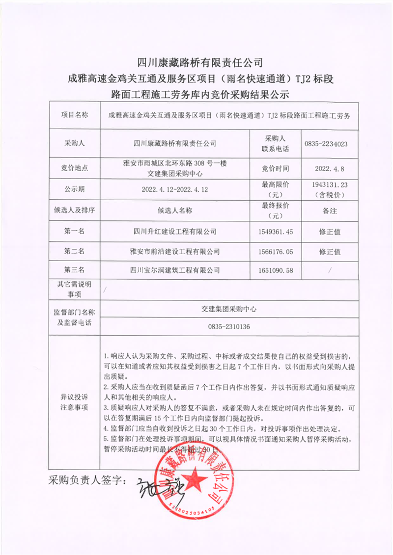 四川康藏路橋有限責(zé)任公司成雅高速金雞關(guān)互通及服務(wù)區(qū)項(xiàng)目(雨名快速通道)TJ2標(biāo)段路面工程施工勞務(wù)庫(kù)內(nèi)競(jìng)價(jià)采購(gòu)結(jié)果公示