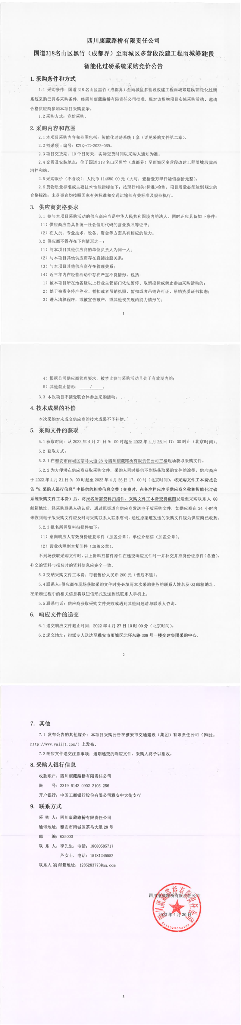 四川康藏路橋有限責(zé)任公司國(guó)道318名山區(qū)黑竹(成都界)至雨城區(qū)多營(yíng)段改建工程雨城籌建段智能化過磅系統(tǒng)采購競(jìng)價(jià)公告