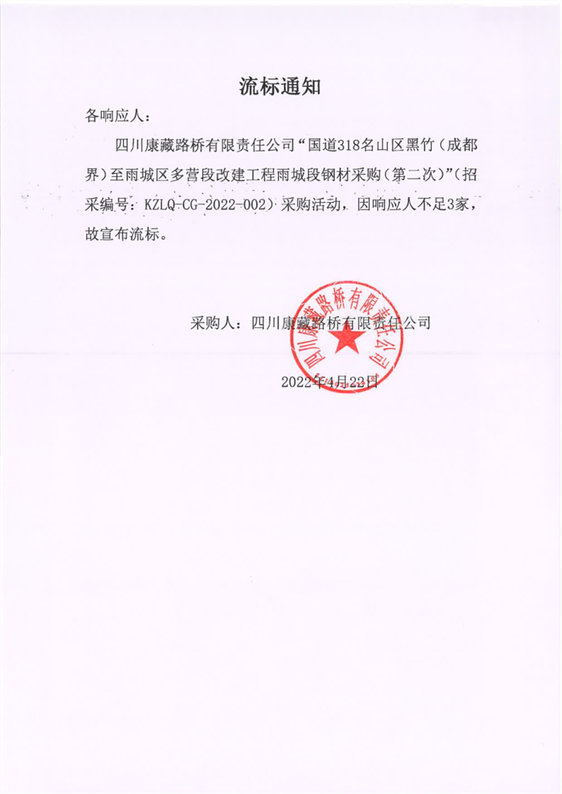 四川康藏路橋有限責(zé)任公司國(guó)道318名山區(qū)黑竹(成都界)至雨城區(qū)多營(yíng)段改建工程雨城段鋼材采購(gòu)(第二次)流標(biāo)通知