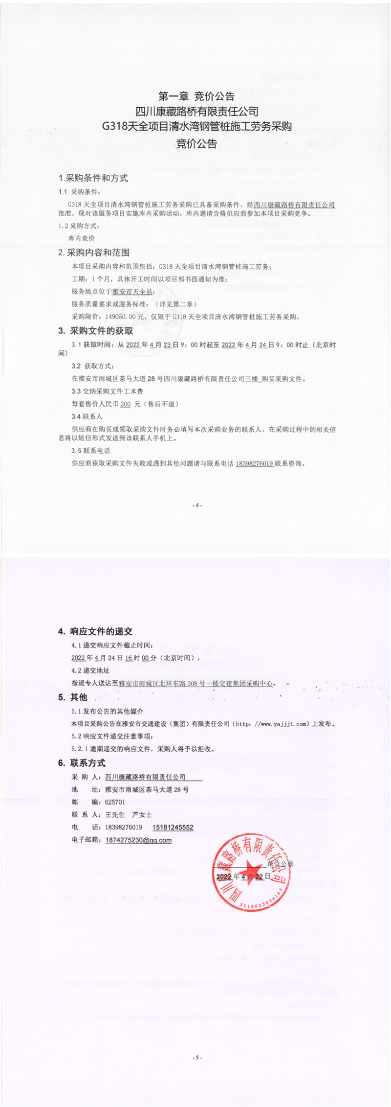 四川康藏路橋有限責(zé)任公司G318天全項目清水灣鋼管樁施工勞務(wù)采購競價公告