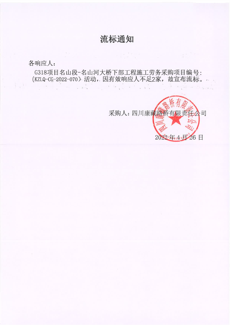 四川康藏路橋有限責(zé)任公司G318項(xiàng)目名山段-名山河大橋下部工程施工勞務(wù)采購項(xiàng)目流標(biāo)通知