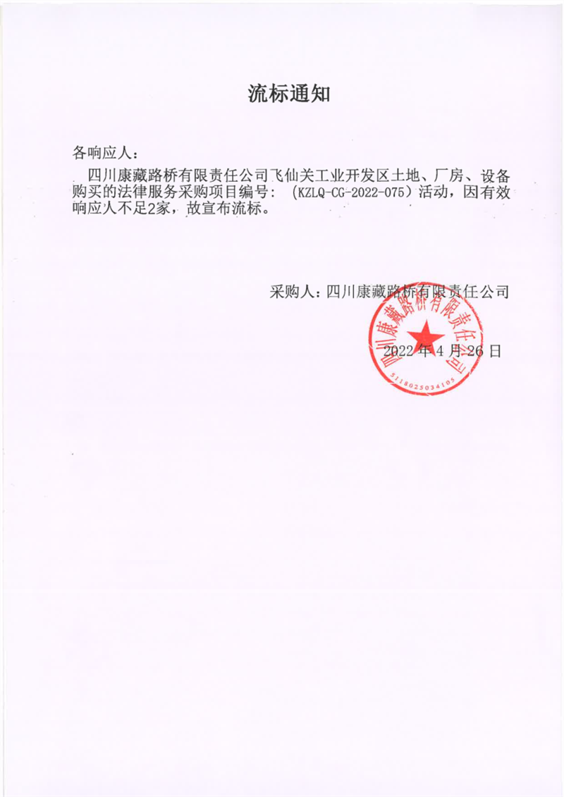 四川康藏路橋有限責(zé)任公司飛仙關(guān)工業(yè)開(kāi)發(fā)區(qū)土地、廠房、設(shè)備購(gòu)買(mǎi)的法律服務(wù)采購(gòu)項(xiàng)目流標(biāo)通知