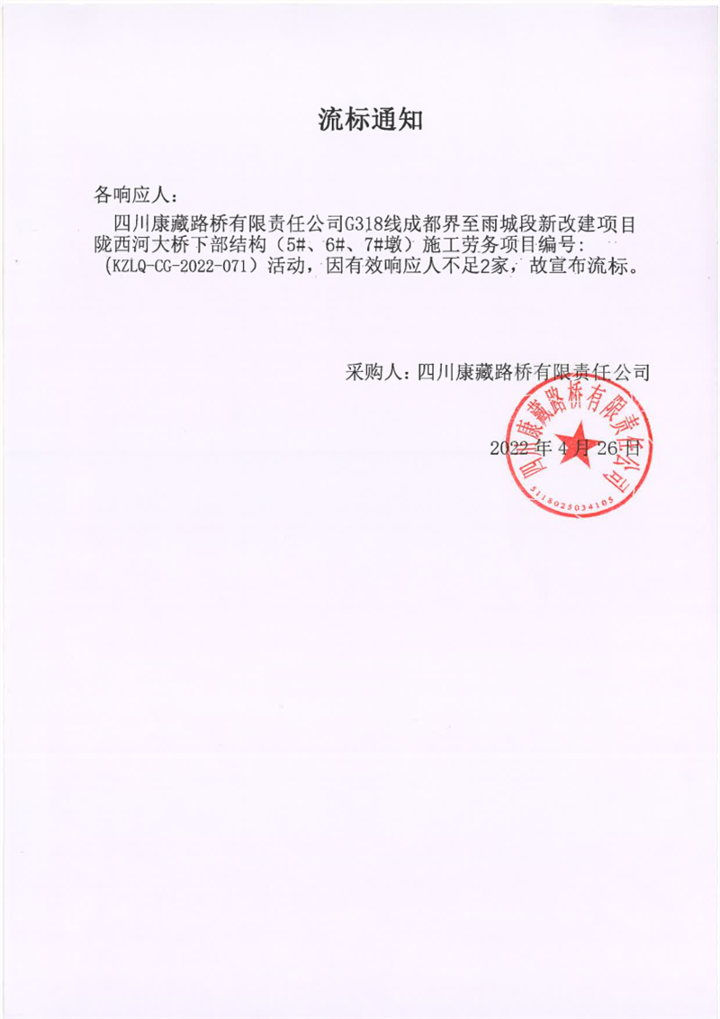 四川康藏路橋有限責(zé)任公司G318線成都界至雨城段新改建項(xiàng)目隴西河大橋下部結(jié)構(gòu)(5#、6#、7#墩)施工勞務(wù)采購(gòu)流標(biāo)通知