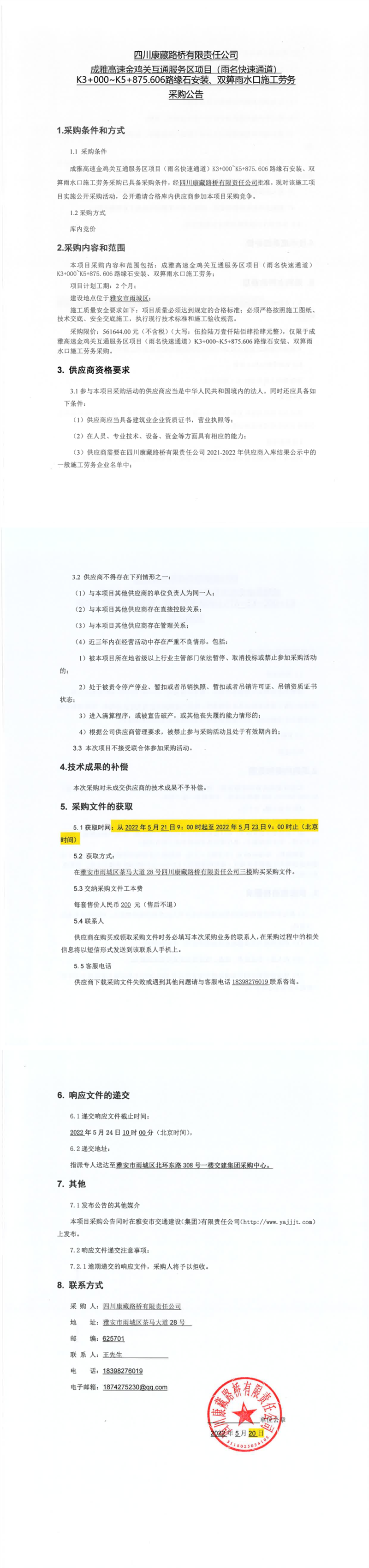 四川康藏路橋有限責(zé)任公司成雅高速金雞關(guān)互通服務(wù)區(qū)項(xiàng)目(雨名快速通道)K3+000-K5+875.606路緣石安裝、雙箅雨水口施工勞務(wù)采購公告