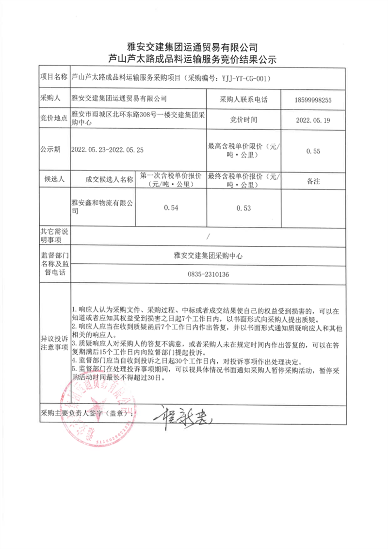 雅安交建集團(tuán)運通貿(mào)易有限公司蘆山蘆太路成品料運輸服務(wù)競價結(jié)果公示