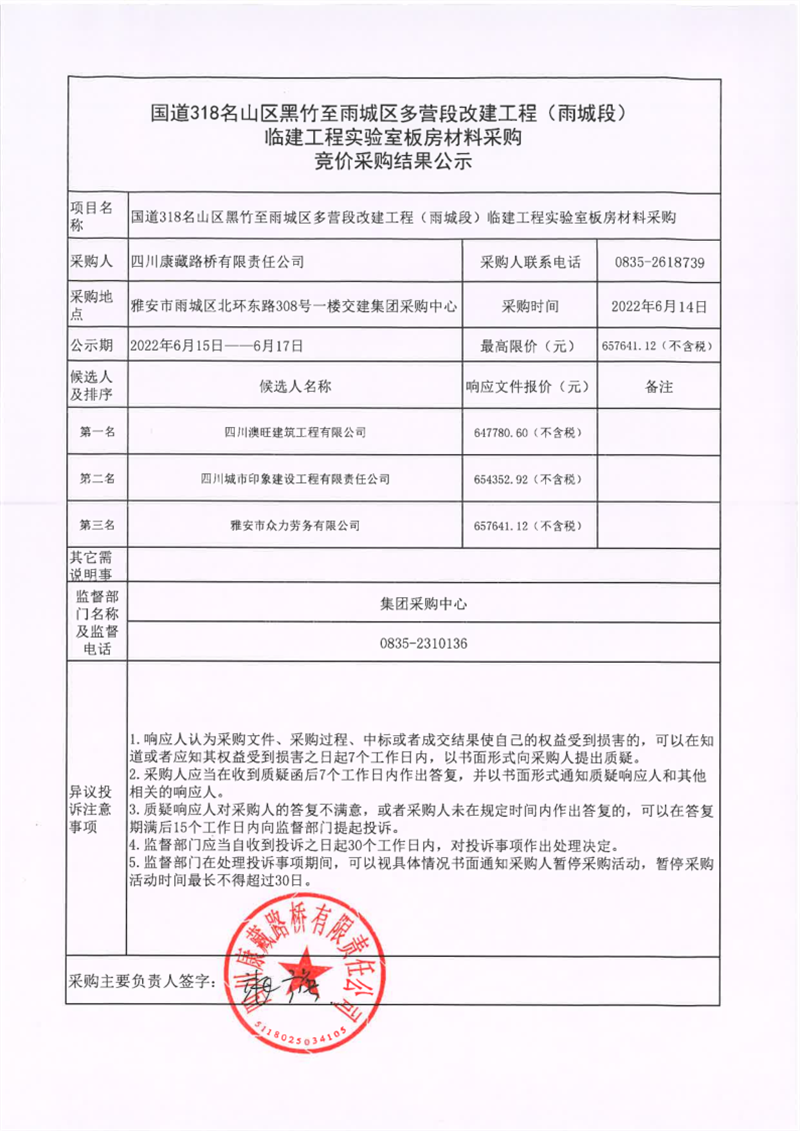 四川康藏路橋有限責(zé)任公司國道318名山區(qū)黑竹至雨城區(qū)多營段改建工程(雨城段)臨建工程實(shí)驗(yàn)室板房材料采購競價采購結(jié)果公示