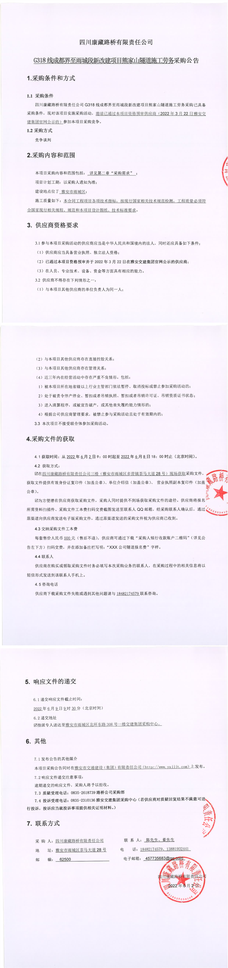 四川康藏路橋有限責任公司G318線成都界至雨城段新改建項目熊家山隧道施工勞務(wù)采購公告