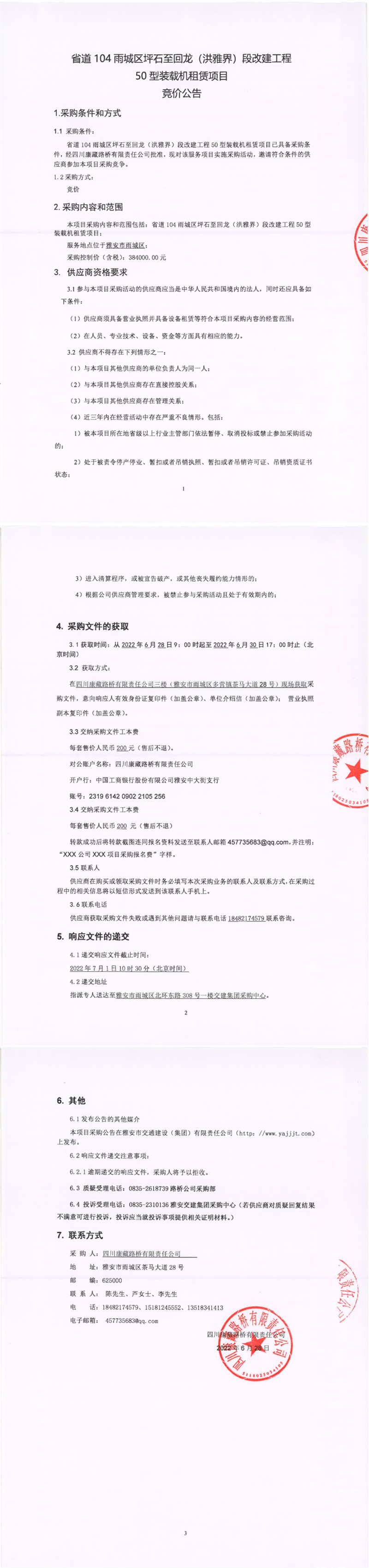 四川康藏路橋有限責(zé)任公司省道104雨城區(qū)坪石至回龍(洪雅界)段改建工程50型裝載機(jī)租賃項目競價公告