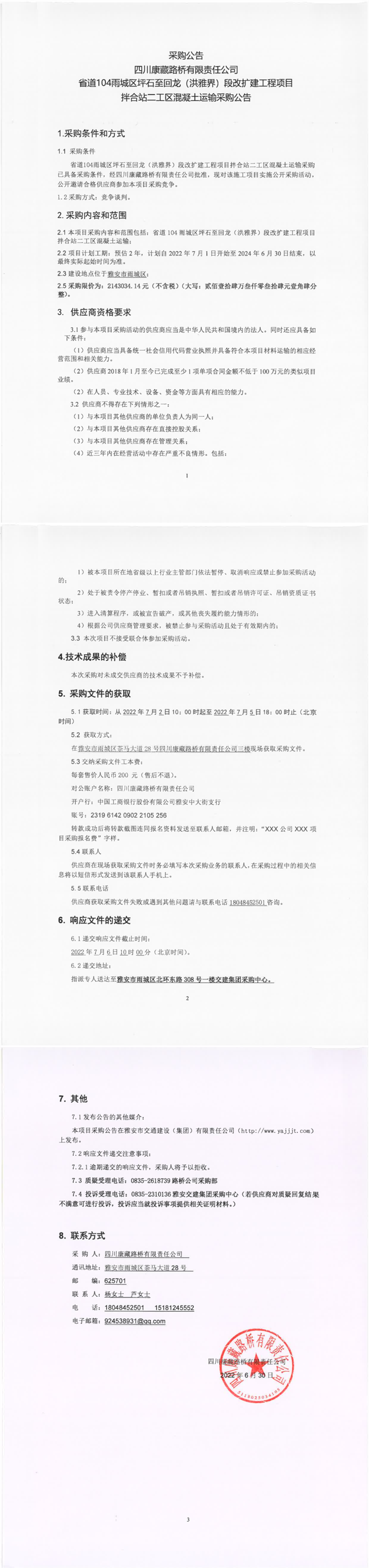 四川康藏路橋有限責(zé)任公司省道104雨城區(qū)坪石至回龍(洪雅界)段改擴(kuò)建工程項(xiàng)目拌合站二工區(qū)混凝土運(yùn)輸采購公告