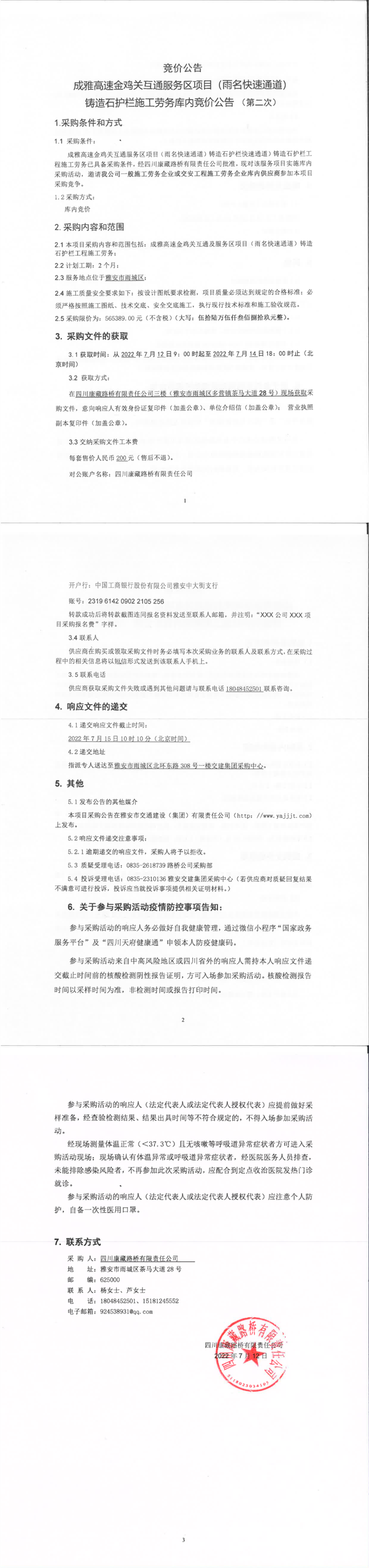 四川康藏路橋有限責任公司成雅高速金雞關(guān)互通服務區(qū)項目(雨名快速通道)鑄造石護欄施工勞務庫內(nèi)競價公告(第二次)