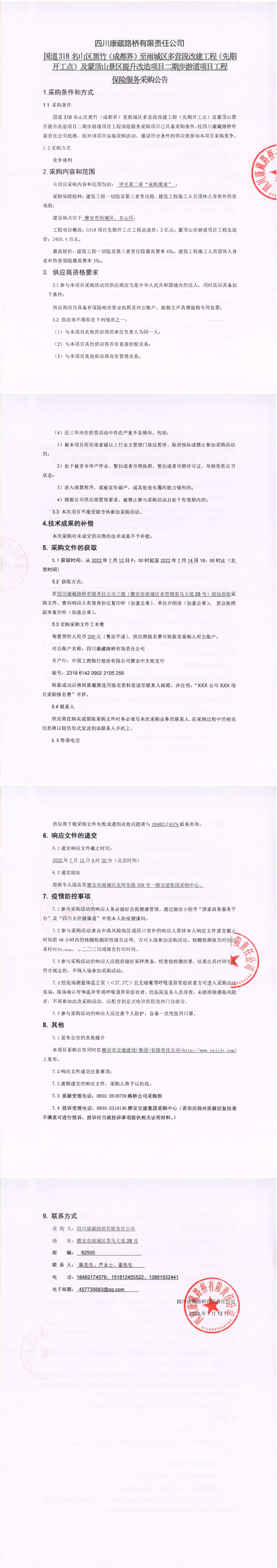 四川康藏路橋有限責任公司國道318名山區(qū)黑竹(成都界)至雨城區(qū)多營段改建工程(先期開工點)及蒙頂山景區(qū)提升改造項目二期步游道項目工程保險服務采購公告