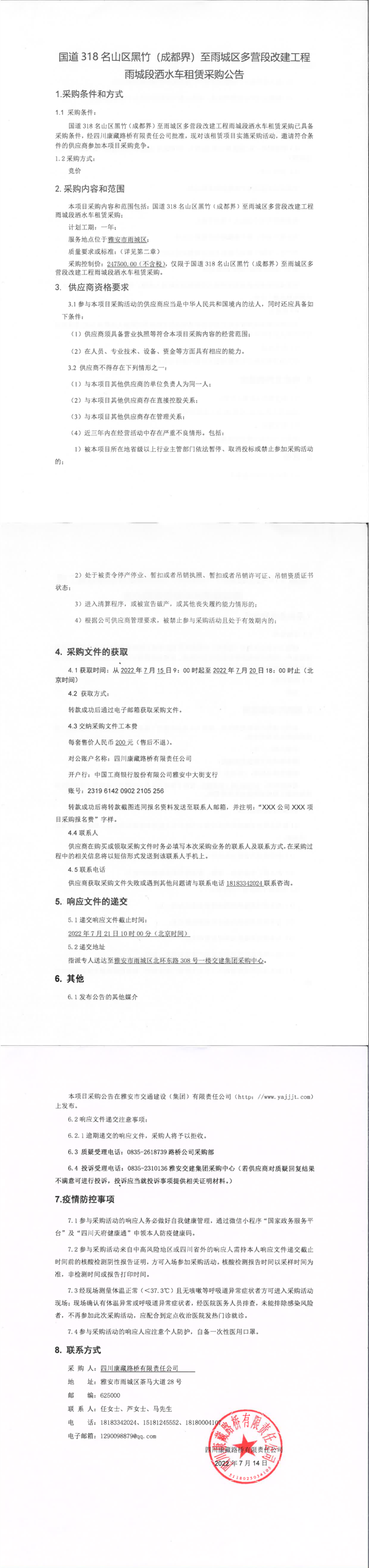 四川康藏路橋有限責(zé)任公司國(guó)道318名山區(qū)黑竹(成都界)至雨城區(qū)多營(yíng)段改建工程雨城段灑水車租賃采購公告
