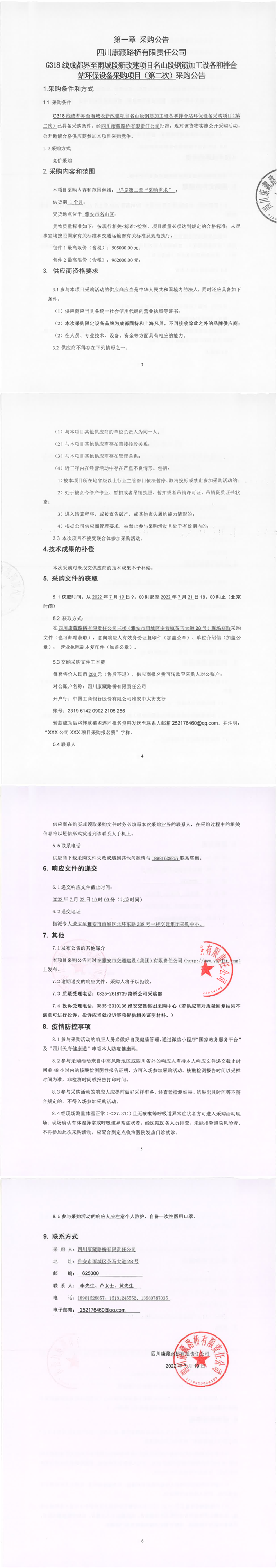 四川康藏路橋有限責任公司G318線成都界至雨城段新改建項目名山段鋼筋加工設(shè)備和拌合站環(huán)保設(shè)備采購項目(第二次)采購公告