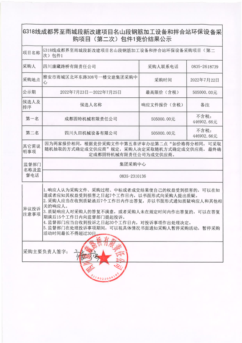 四川康藏路橋有限責(zé)任公司G318線成都界至雨城段新改建項(xiàng)目名山段鋼筋加工設(shè)備和拌合站環(huán)保設(shè)備采購項(xiàng)目(第二次)包件1競價(jià)結(jié)果公示