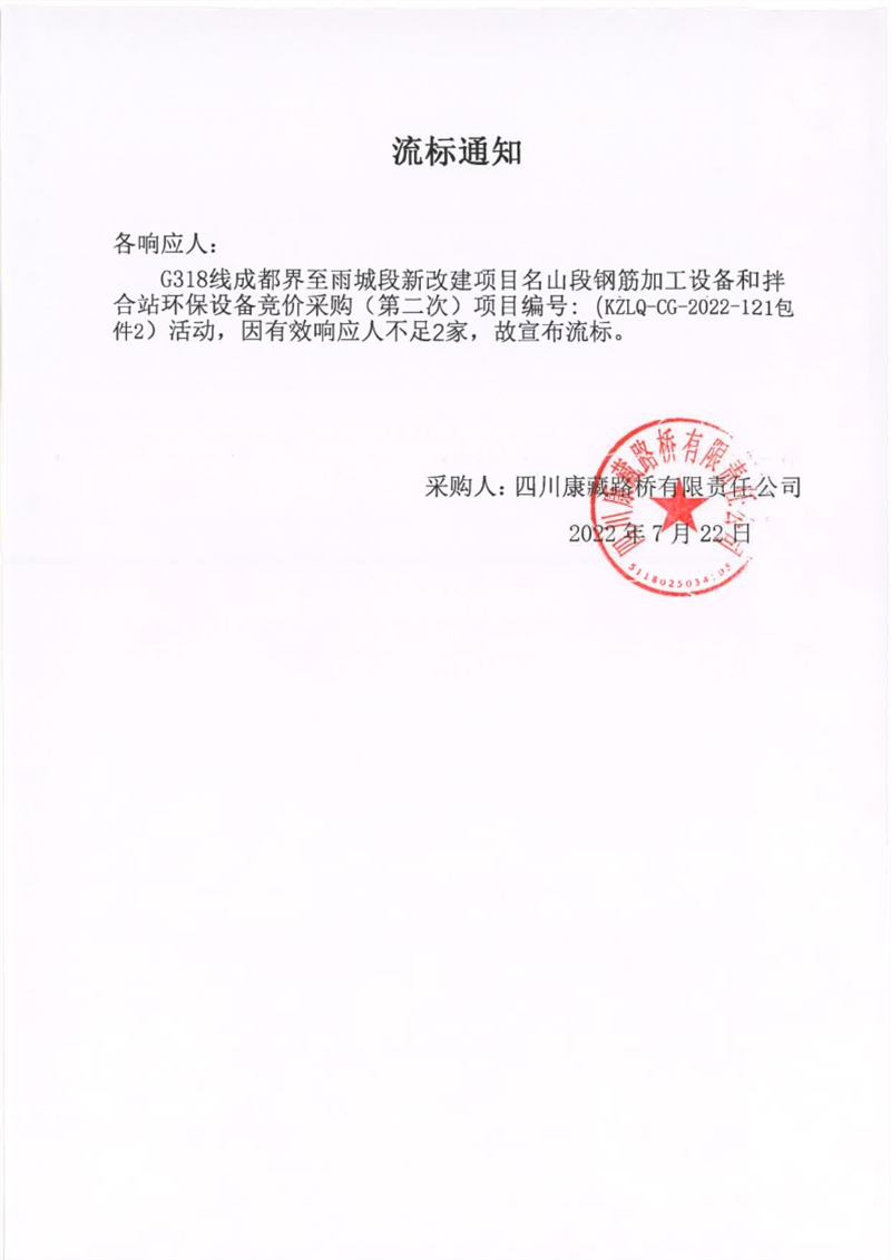 四川康藏路橋有限責任公司G318線成都界至雨城段新改建項目名山段鋼筋加工設備和拌合站環(huán)保設備競價采購(第二次)包件2流標通知