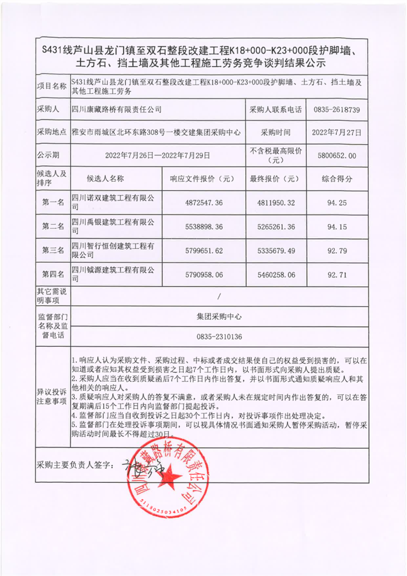 四川康藏路橋有限責(zé)任公司S431線蘆山縣龍門鎮(zhèn)至雙石整段改建工程K18+000-K23+000段護(hù)腳墻、土方石、擋土墻及其他工程施工勞務(wù)競(jìng)爭談判結(jié)果公示