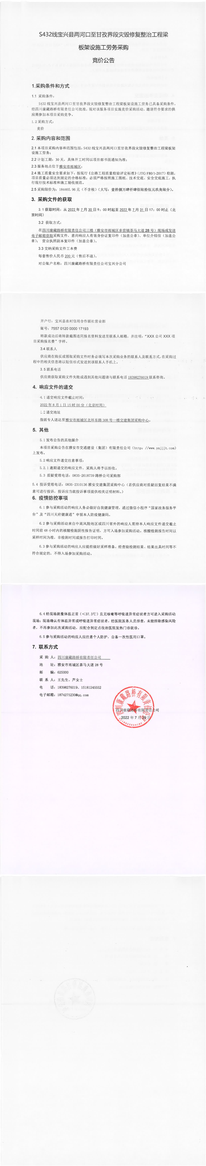 四川康藏路橋有限責任公司S432線寶興縣兩河口至甘孜界段災毀修復整治工程梁板架設(shè)施工勞務采購競價公告