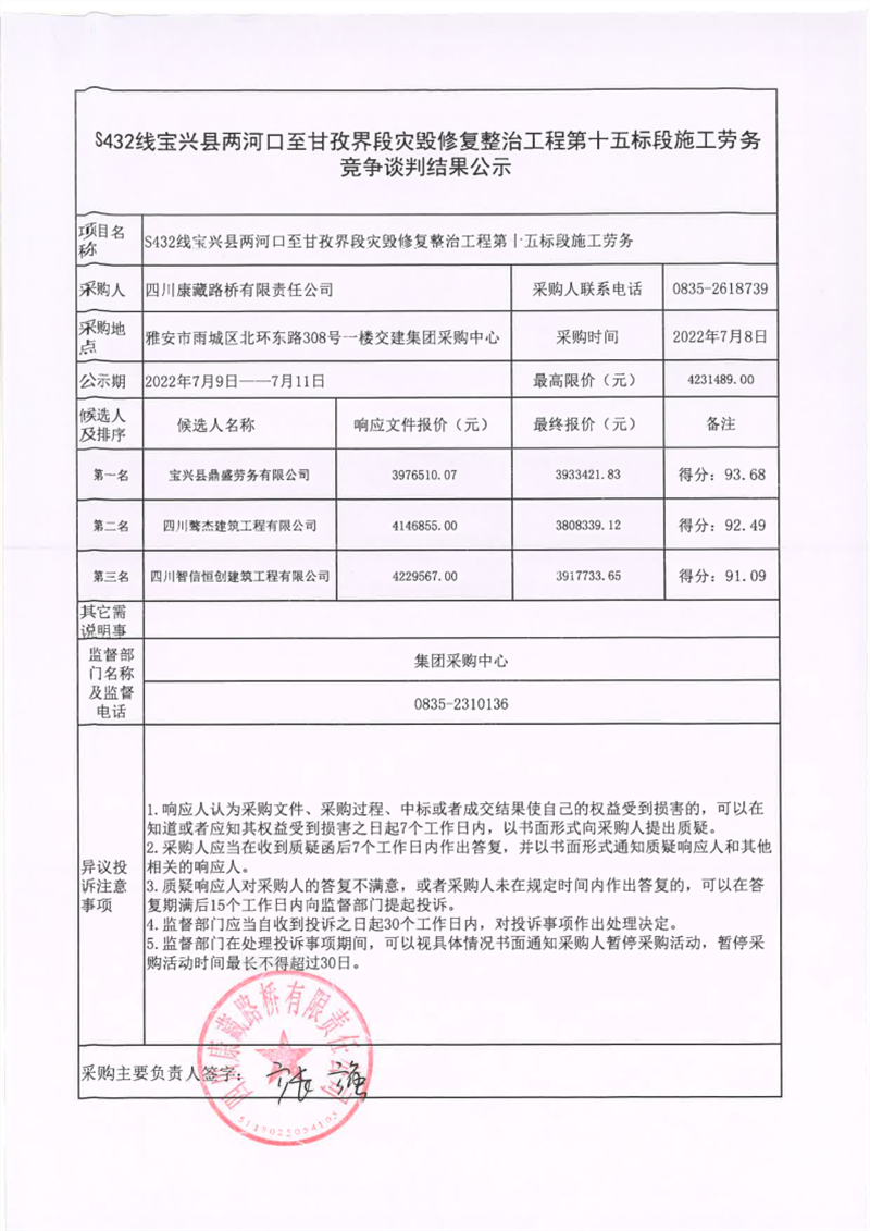 四川康藏路橋有限責任公司S432線寶興縣兩河口至甘孜界段災毀修復整治工程第十五標段施工勞務競爭談判結果公示