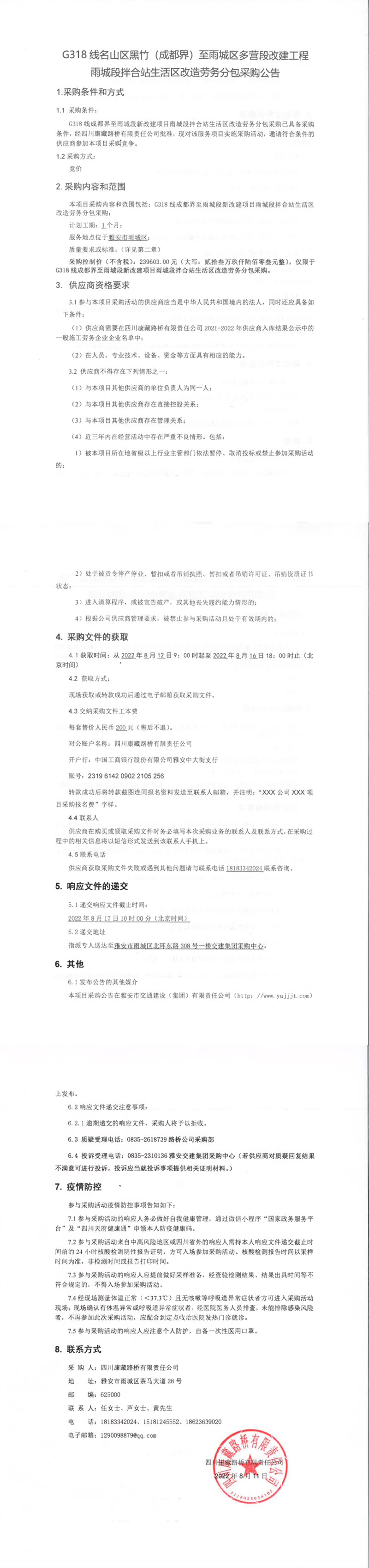四川康藏路橋有限責任公司G318線名山區(qū)黑竹(成都界)至雨城區(qū)多營段改建工程雨城段拌合站生活區(qū)改造勞務分包采購公告