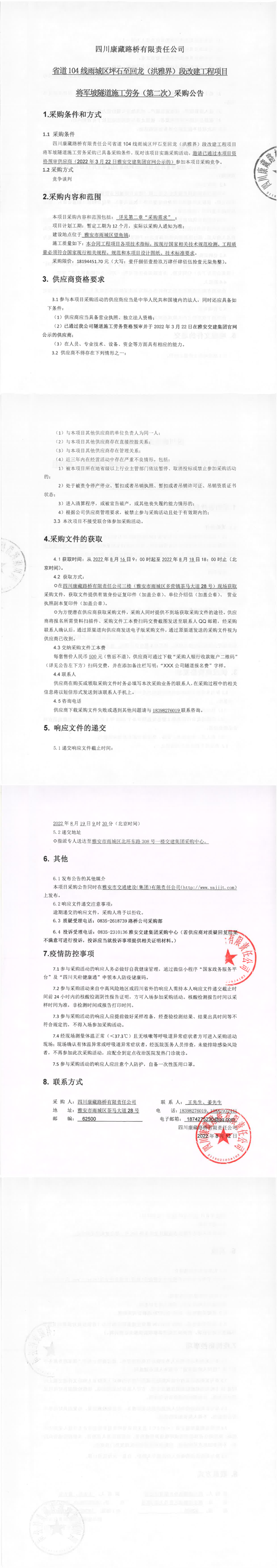 四川康藏路橋有限責(zé)任公司省道104線雨城區(qū)坪石至回龍(洪雅界)段改建工程項目