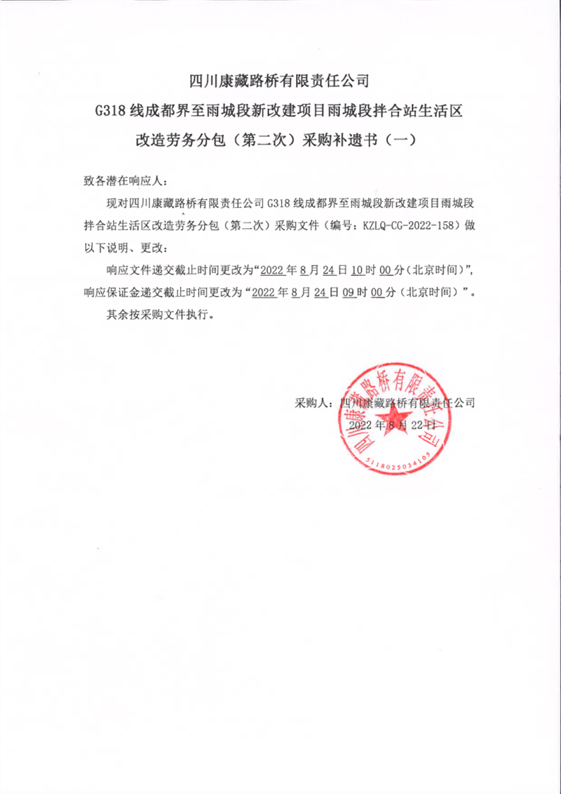 四川康藏路橋有限責任公司G318線成都界至雨城段新改建項目雨城段拌合站生活區(qū)改造勞務分包(第二次)采購補遺書(一)