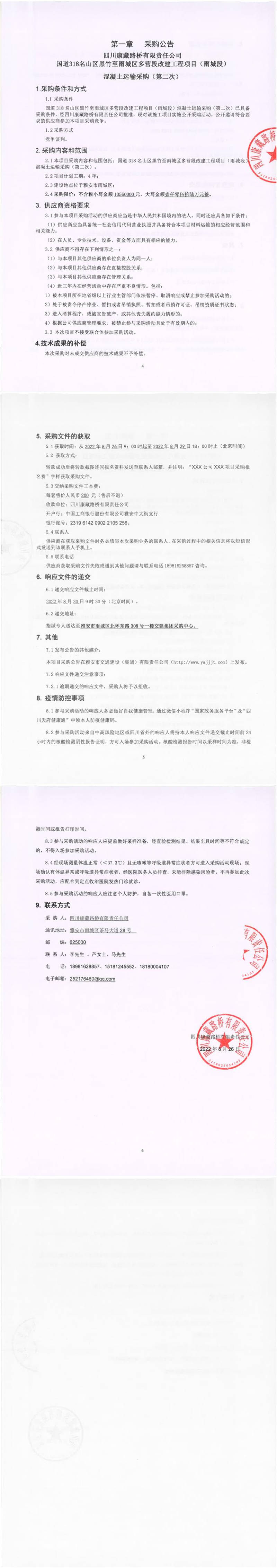 四川康藏路橋有限責(zé)任公司國道318名山區(qū)黑竹至雨城區(qū)多營段改建工程項(xiàng)目(雨城段)混凝土運(yùn)輸(第二次)采購公告