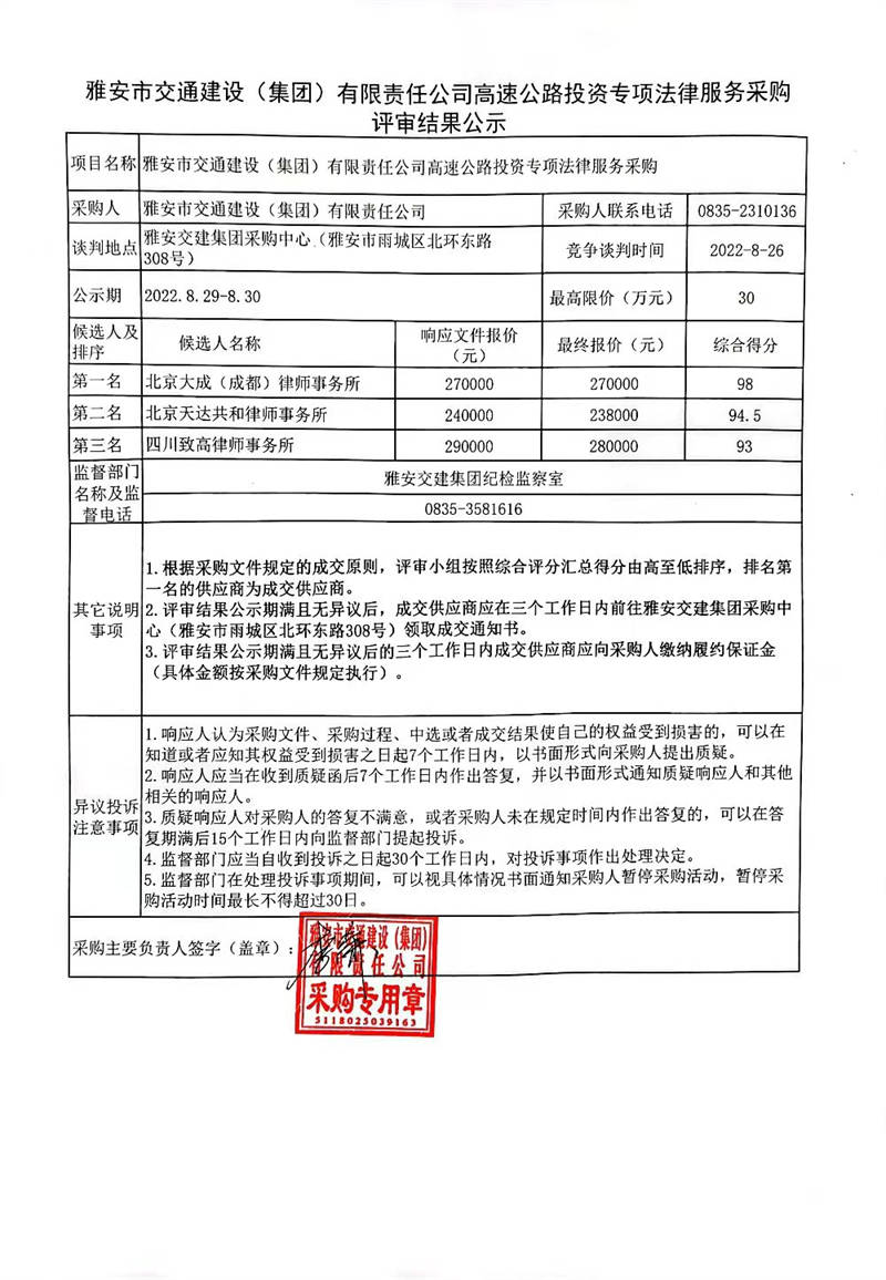 雅安市交通建設(shè)(集團(tuán))有限責(zé)任公司高速公路投資專項(xiàng)法律服務(wù)采購評(píng)審結(jié)果公示