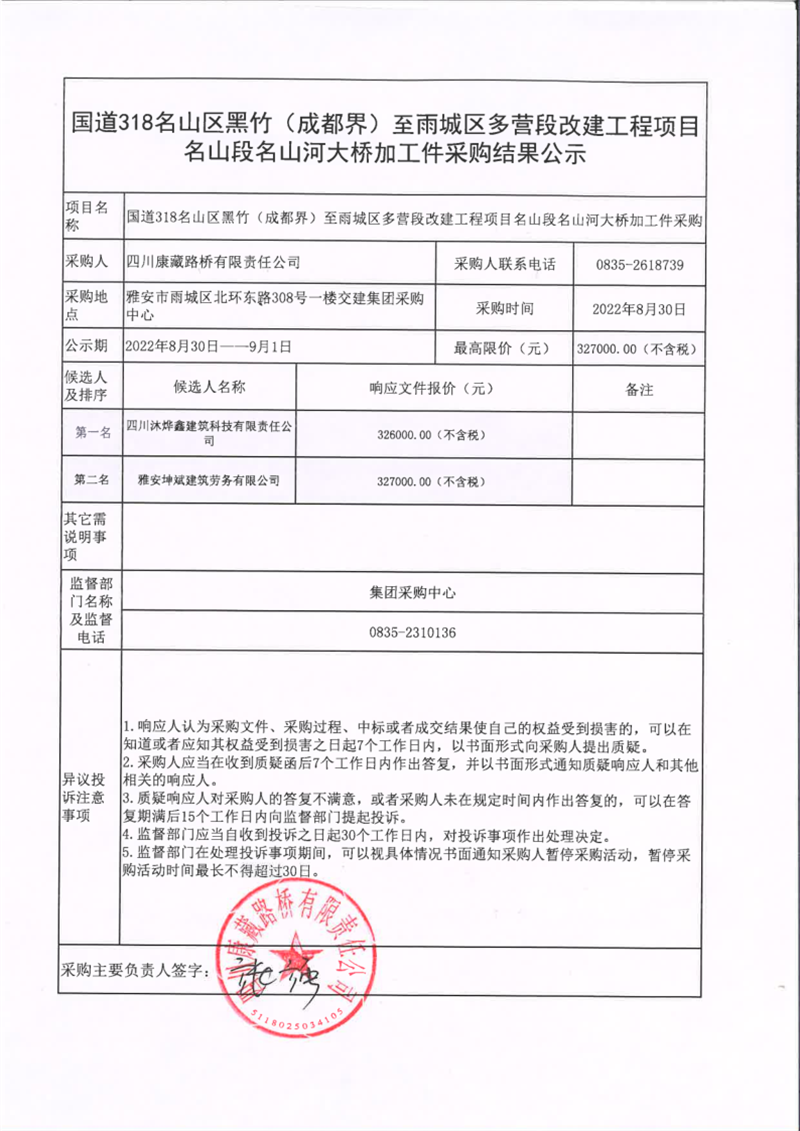 四川康藏路橋有限責(zé)任公司國(guó)道318名山區(qū)黑竹(成都界)至雨城區(qū)多營(yíng)段改建工程項(xiàng)目名山段名山河大橋加工件采購(gòu)結(jié)果公示