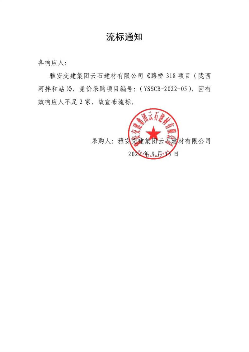 雅安交建集團(tuán)云石建材有限公司成品料運(yùn)輸服務(wù)采購(皇茶大道拌和站)流標(biāo)通知