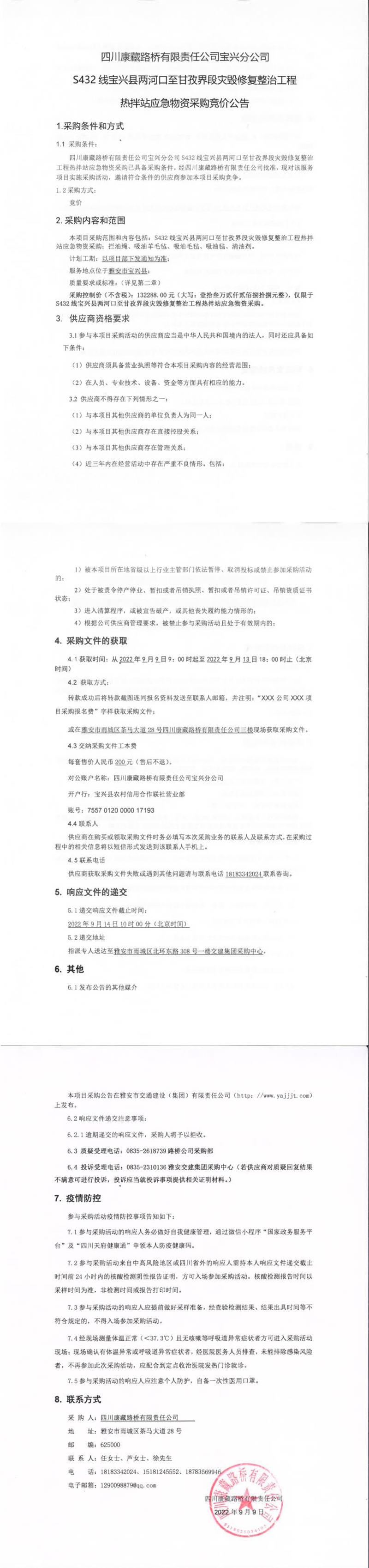 四川康藏路橋有限責(zé)任公司S432線寶興縣兩河口至甘孜界段災(zāi)毀修復(fù)整治工程熱拌站應(yīng)急物資采購(gòu)競(jìng)價(jià)公告