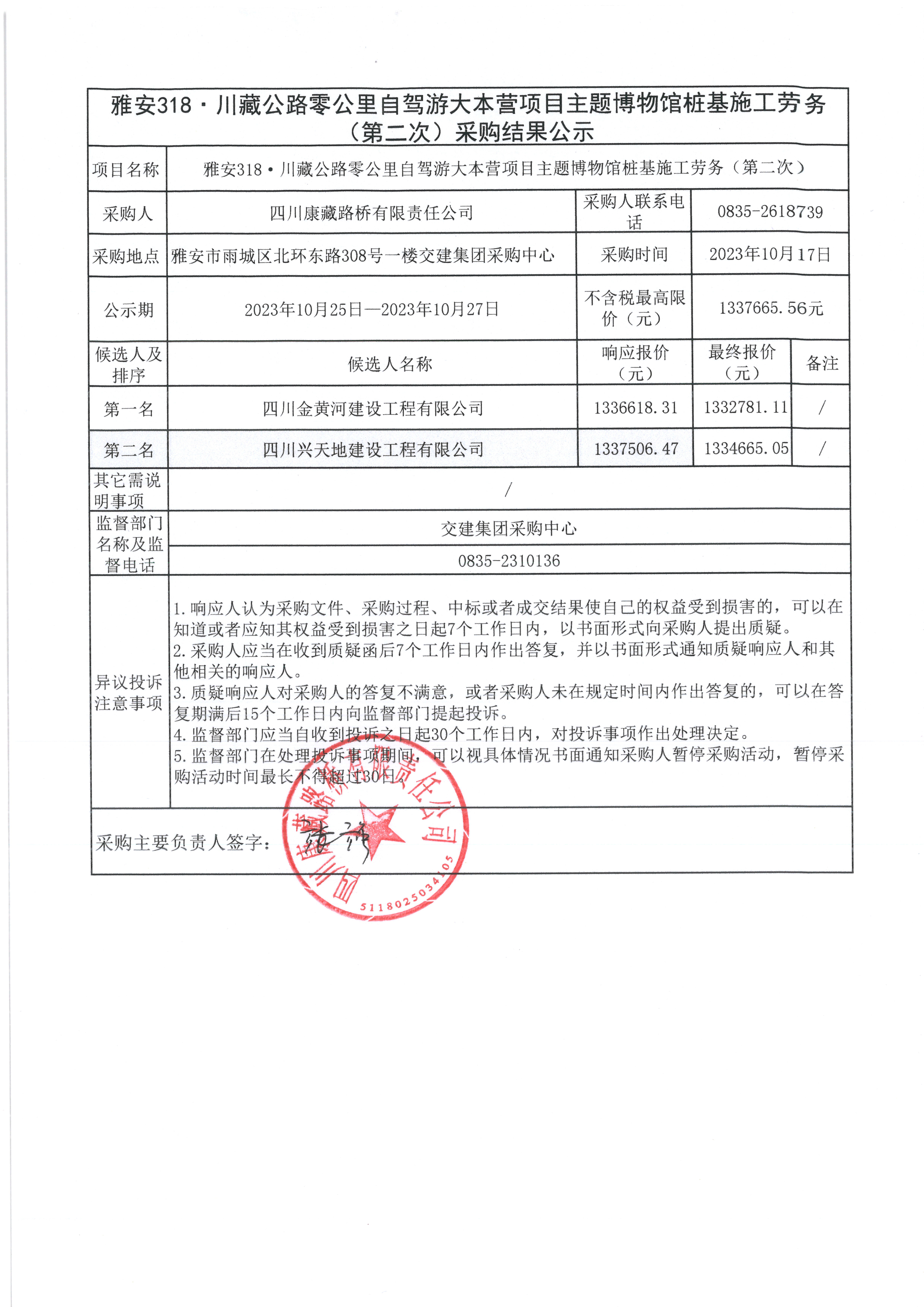 四川康藏路橋有限責(zé)任公司雅安318·川藏公路零公里自駕游大本營(yíng)項(xiàng)目主題博物館樁基施工勞務(wù)(第二次)采購(gòu)結(jié)果公示