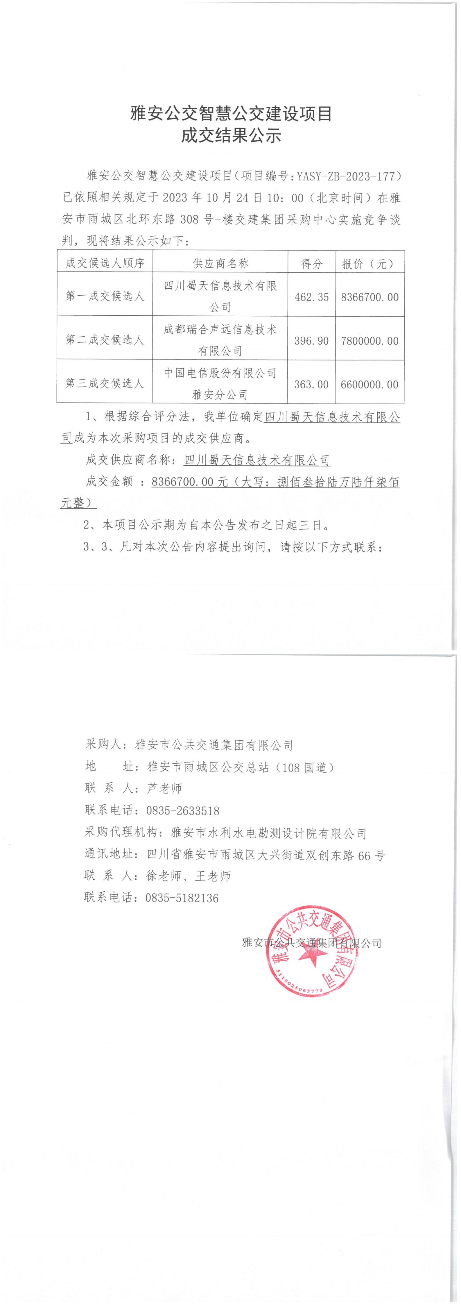 雅安市公共交通集團(tuán)有限公司雅安公交智慧公交建設(shè)項目成交結(jié)果公示