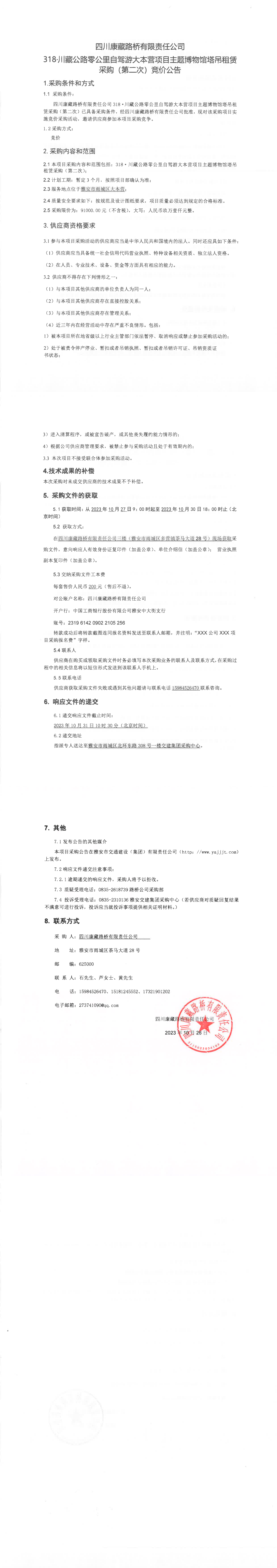 四川康藏路橋有限責任公司318·川藏公路零公里自駕游大本營項目主題博物館塔吊租賃(第二次)采購競價公告