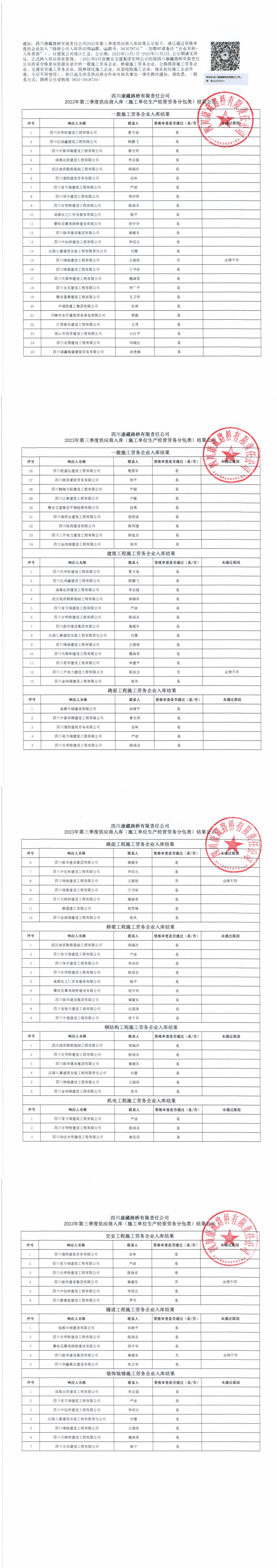 四川康藏路橋有限責任公司2023年第三季度供應商入庫(施工單位生產(chǎn)經(jīng)營勞務分包類)結果公示