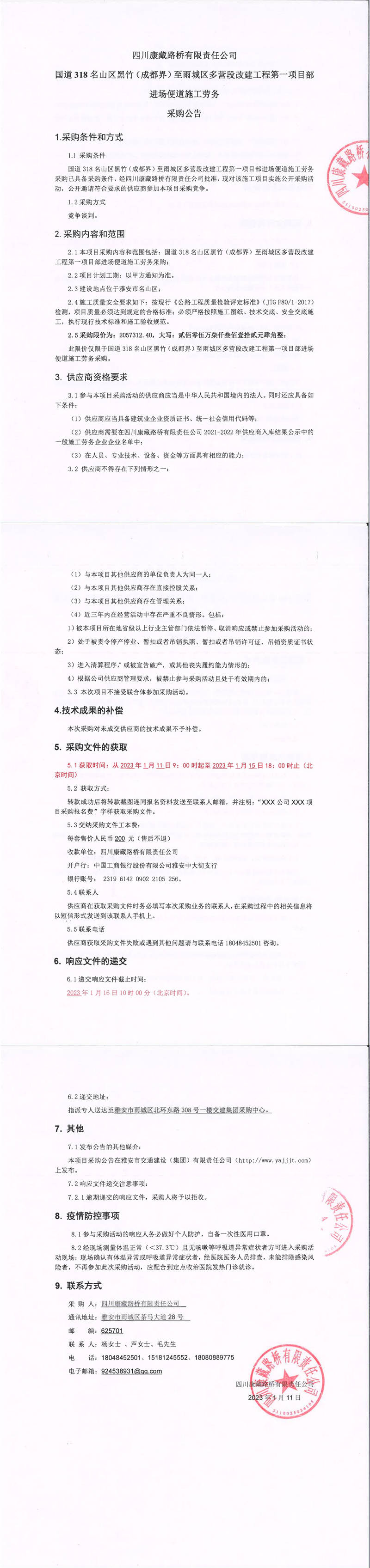四川康藏路橋有限責(zé)任公司國道318名山區(qū)黑竹(成都界)至雨城區(qū)多營段改建工程第一項目部進(jìn)場便道施工勞務(wù)采購公告