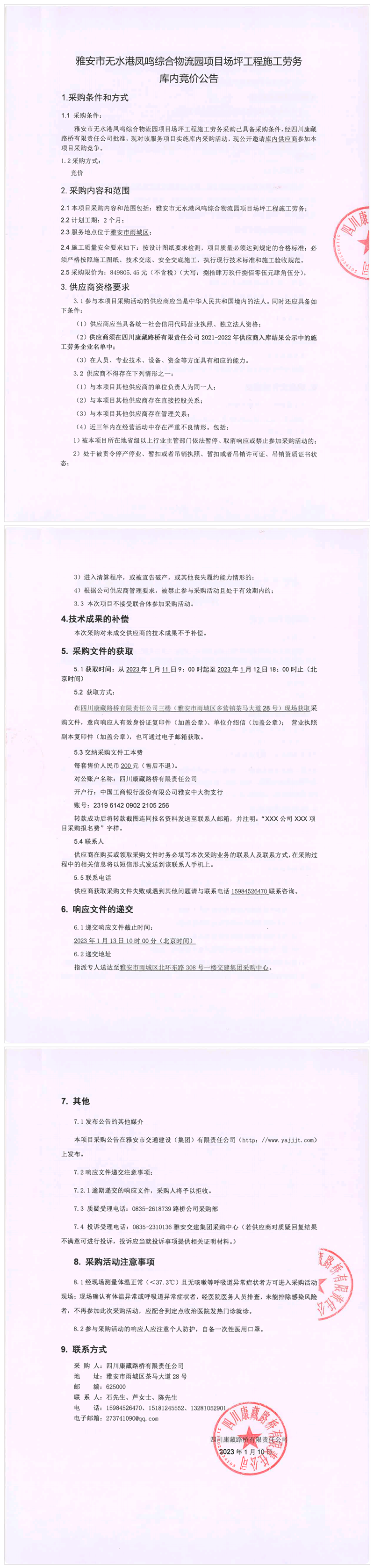 四川康藏路橋有限責(zé)任公司雅安市無水港鳳鳴綜合物流園項(xiàng)目場(chǎng)坪工程施工勞務(wù)庫內(nèi)競(jìng)價(jià)公告