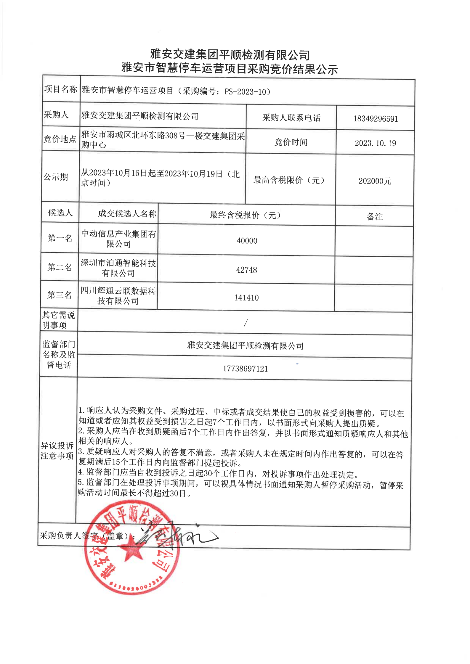 雅安交建集團(tuán)平順檢測(cè)有限公司雅安市智慧停車(chē)運(yùn)營(yíng)項(xiàng)目采購(gòu)競(jìng)價(jià)結(jié)果公示