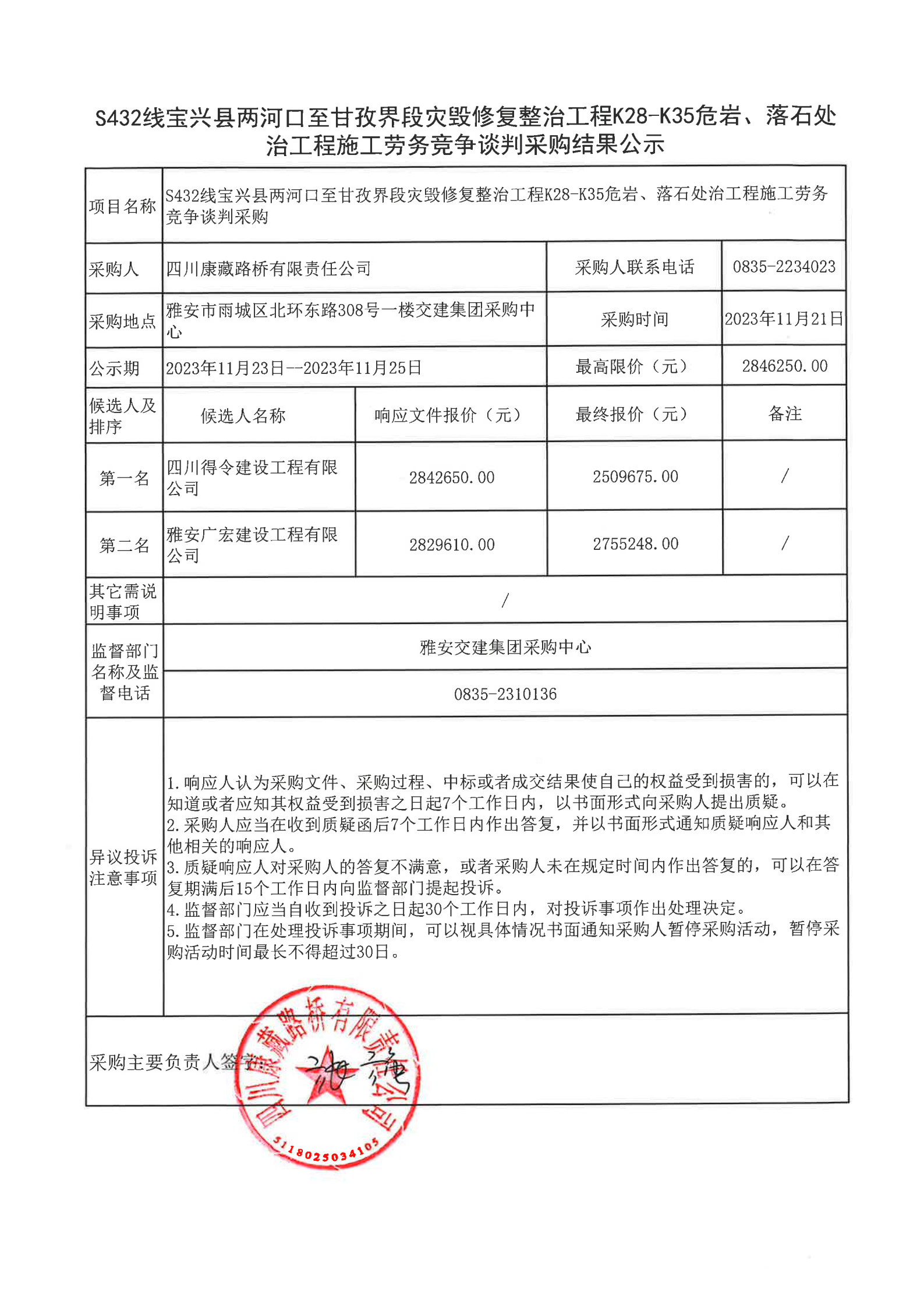 四川康藏路橋有限責(zé)任公司S432線寶興縣兩河口至甘孜界段災(zāi)毀修復(fù)整治工程K28-K35危巖、落石處治工程施工勞務(wù)競(jìng)爭(zhēng)談判采購(gòu)結(jié)果公示