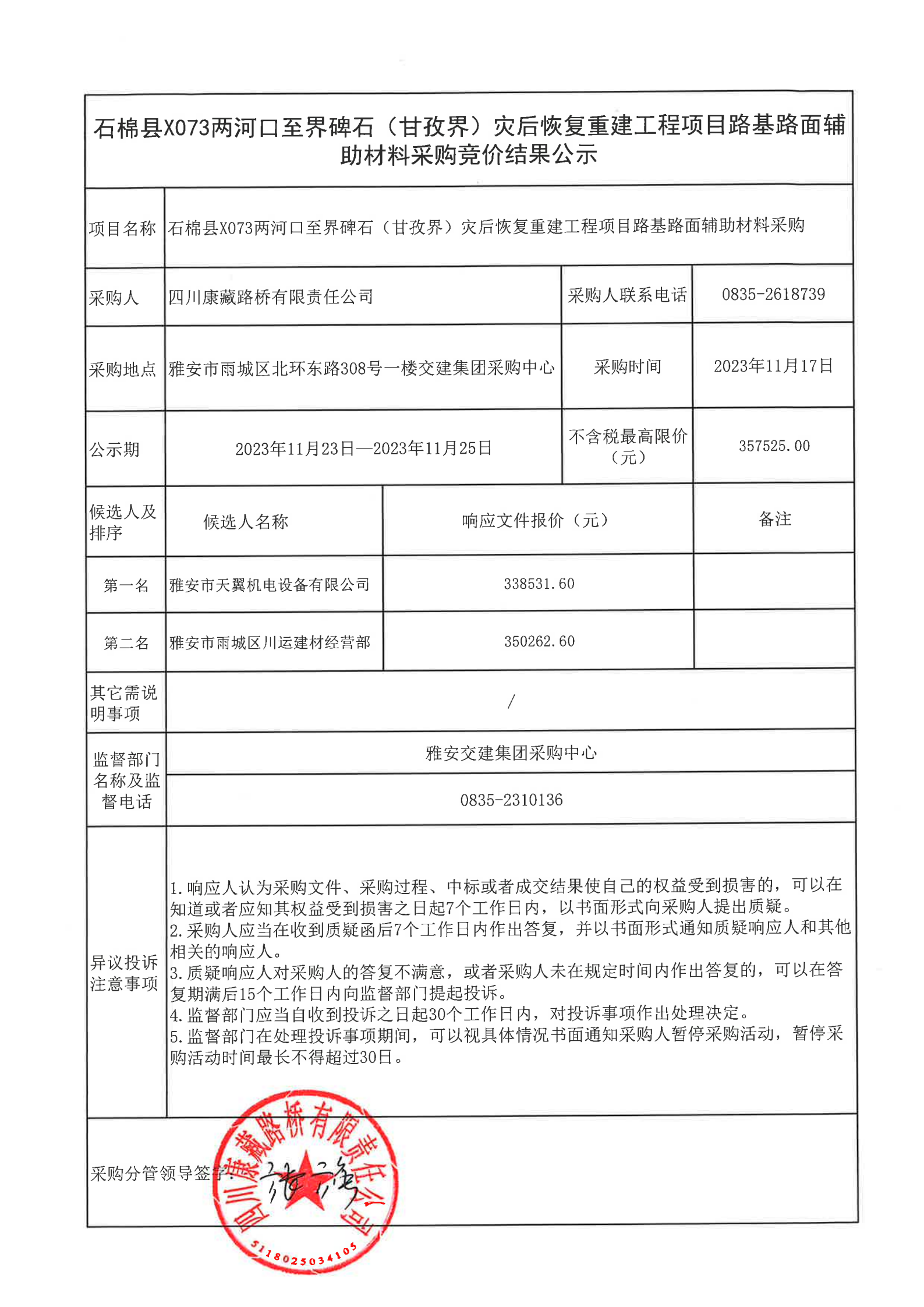 四川康藏路橋有限責(zé)任公司石棉縣X073兩河口至界碑石(甘孜界)災(zāi)后恢復(fù)重建工程項(xiàng)目路基路面輔助材料采購(gòu)結(jié)果公示