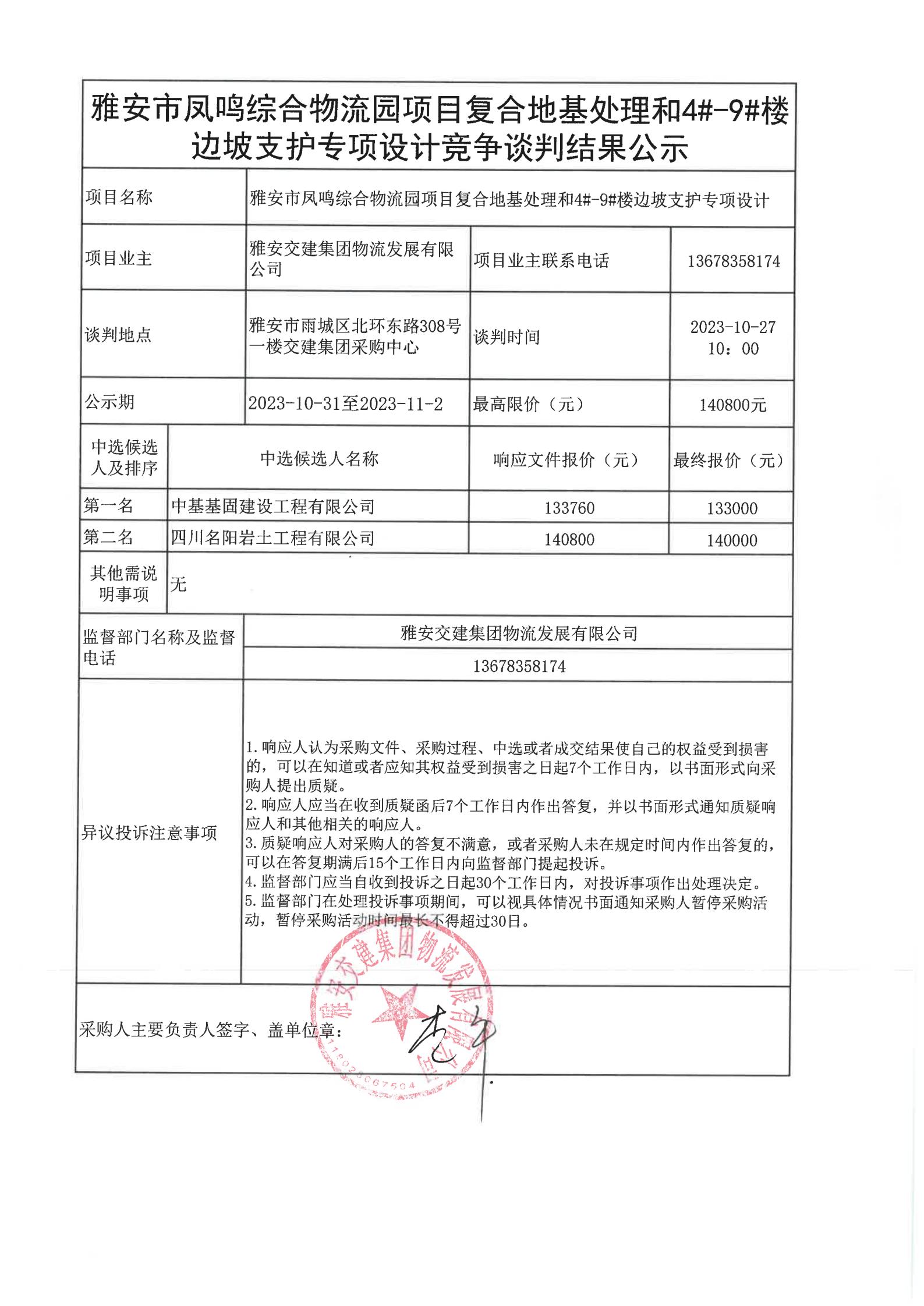 雅安交建集團物流發(fā)展有限公司雅安市鳳鳴綜合物流園項目復(fù)合地基處理和4#-9#樓邊坡支護專項設(shè)計競爭談判結(jié)果公示