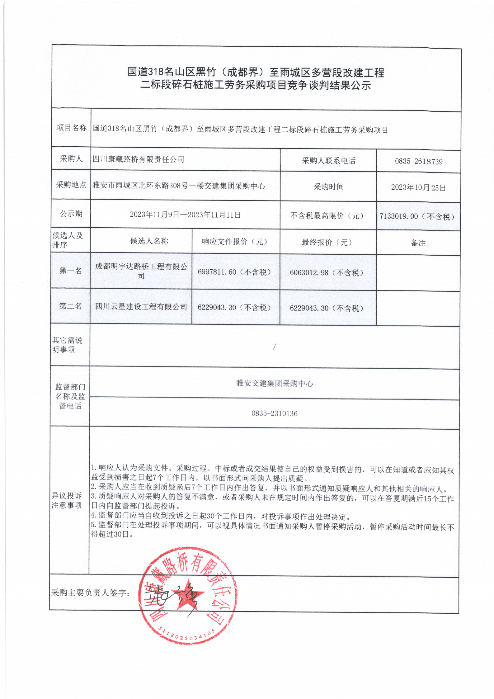 四川康藏路橋有限責(zé)任公司國道318名山區(qū)黑竹(成都界)至雨城區(qū)多營段改建工程二標(biāo)段碎石樁施工勞務(wù)采購項目競爭談判結(jié)果公示