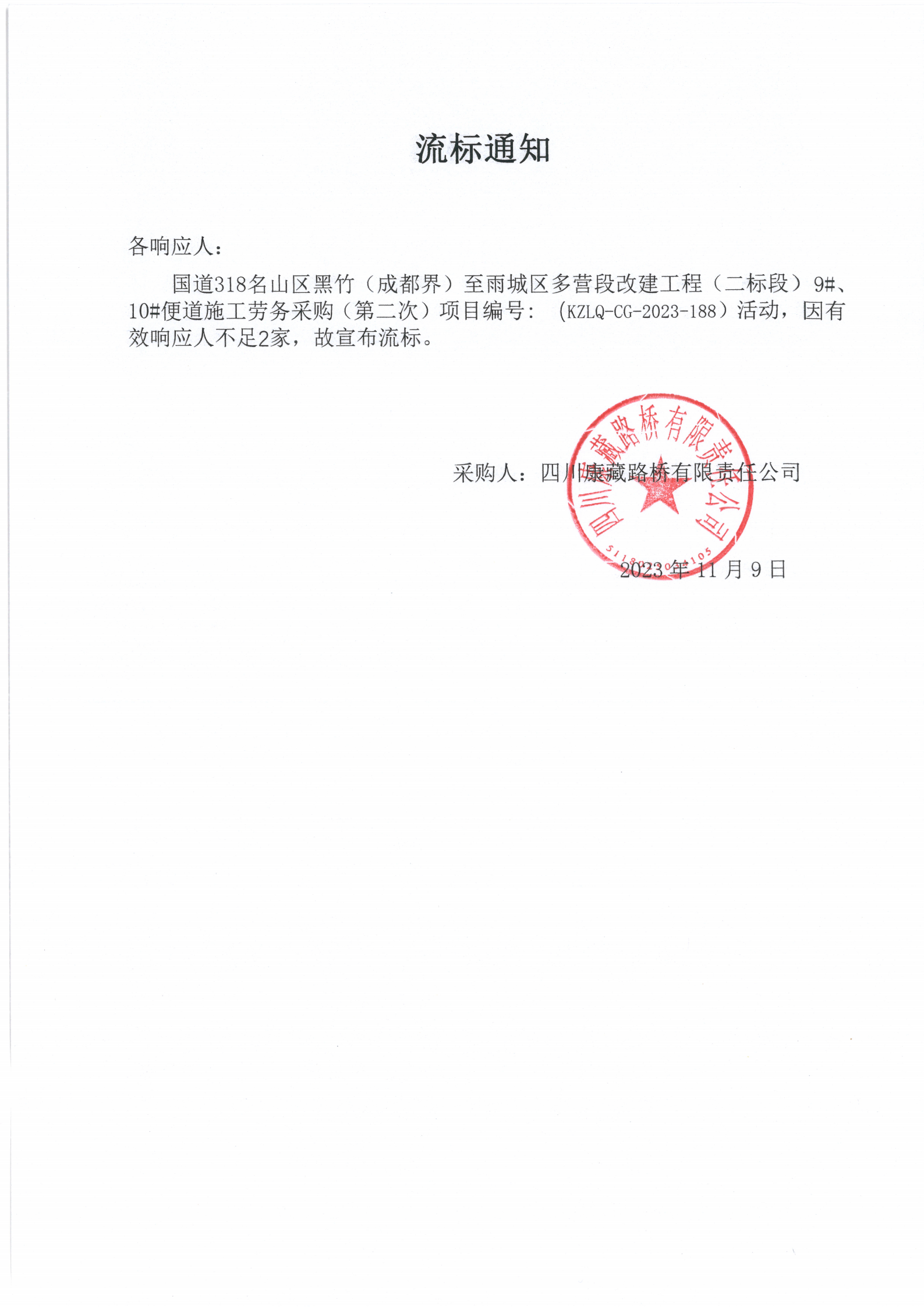 四川康藏路橋有限責任公司國道318名山區(qū)黑竹(成都界)至雨城區(qū)多營段改建工程二標段9#、10#便道施工勞務采購(第二次)流標通知