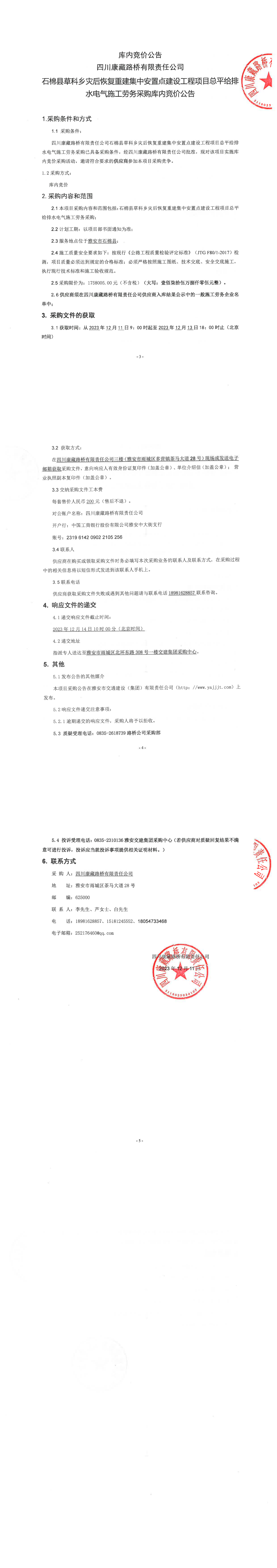 四川康藏路橋有限責(zé)任公司石棉縣草科鄉(xiāng)災(zāi)后恢復(fù)重建集中安置點(diǎn)建設(shè)工程項(xiàng)目總平給排水電氣施工勞務(wù)采購(gòu)庫內(nèi)競(jìng)價(jià)公告