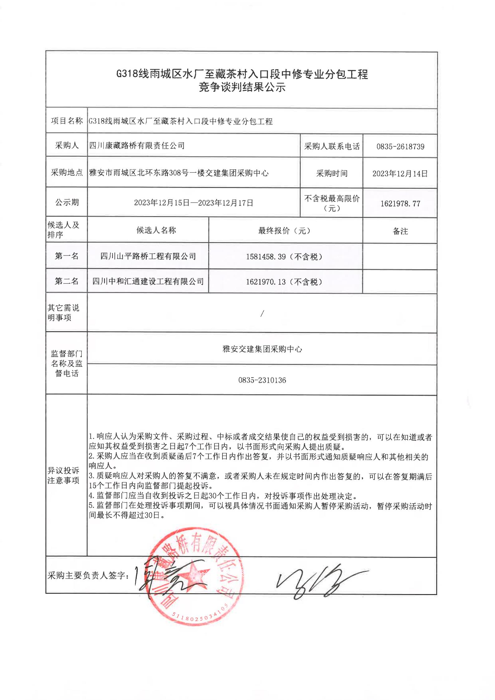 四川康藏路橋有限責任公司G318線雨城區(qū)水廠至藏茶村入口段中修專業(yè)分包工程競爭談判結果公示