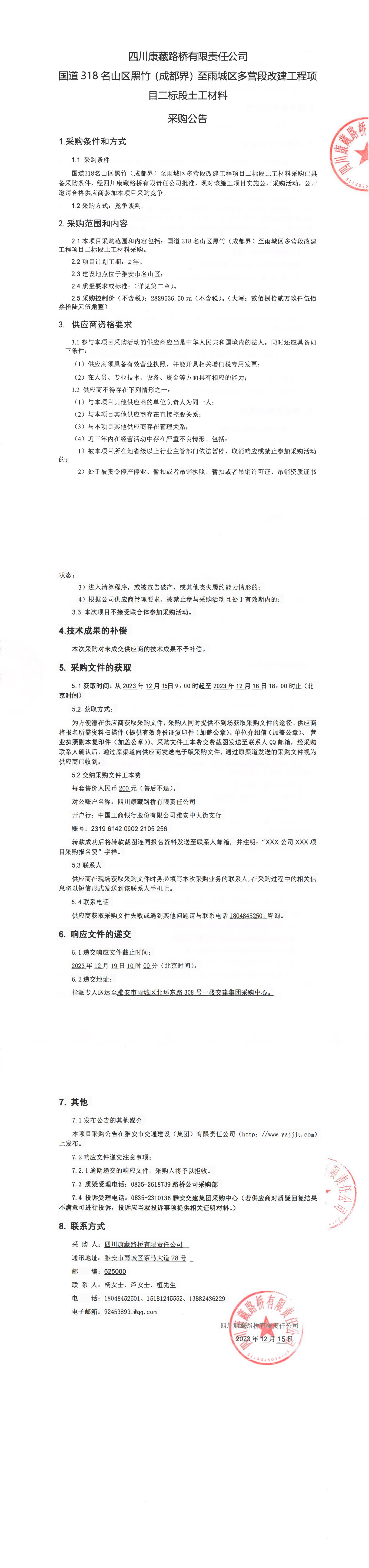 四川康藏路橋有限責(zé)任公司國道318名山區(qū)黑竹(成都界)至雨城區(qū)多營段改建工程項(xiàng)目二標(biāo)段土工材料采購公告