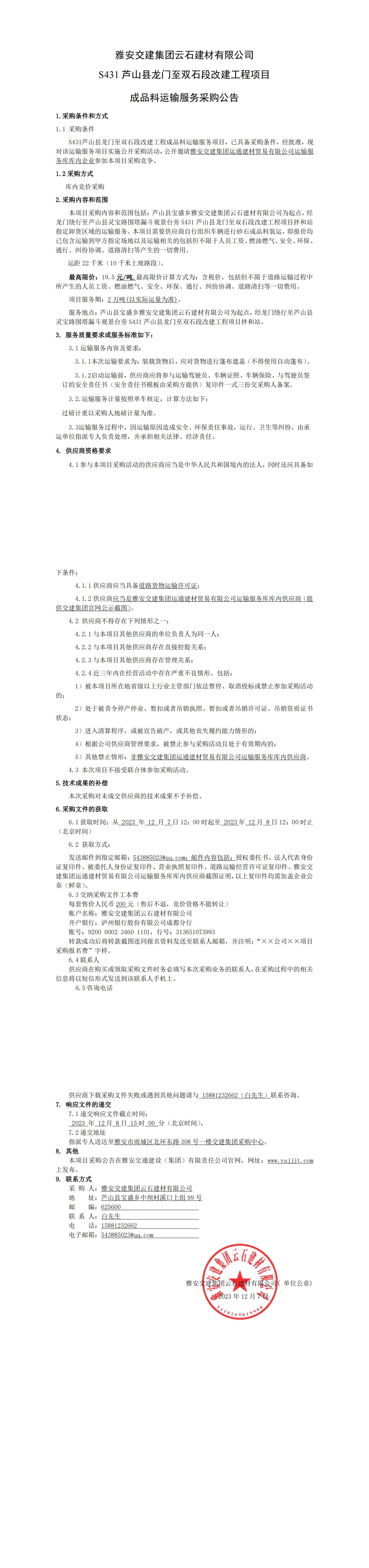 雅安交建集團(tuán)云石建材有限公司S431蘆山縣龍門至雙石段改建工程項(xiàng)目成品料運(yùn)輸服務(wù)采購(gòu)公告