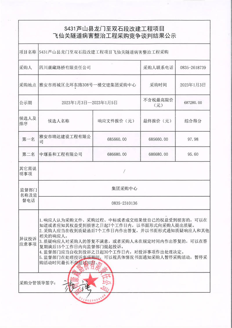 四川康藏路橋有限責任公司S431蘆山縣龍門至雙石段改建工程項目飛仙關(guān)隧道病害整治工程采購競爭談判結(jié)果公示