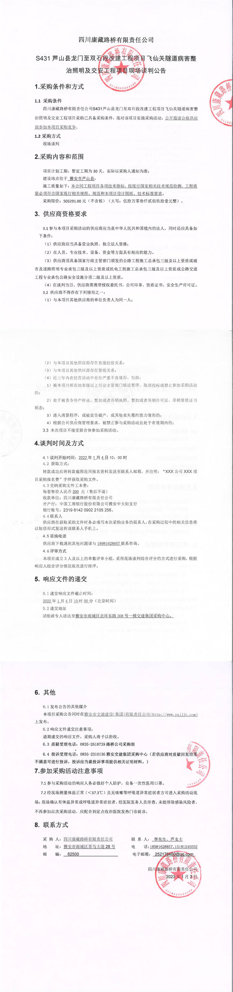 四川康藏路橋有限責(zé)任公司S431蘆山縣龍門至雙石段改建工程項(xiàng)目飛仙關(guān)隧道病害整治照明及交安工程項(xiàng)目現(xiàn)場(chǎng)談判公告
