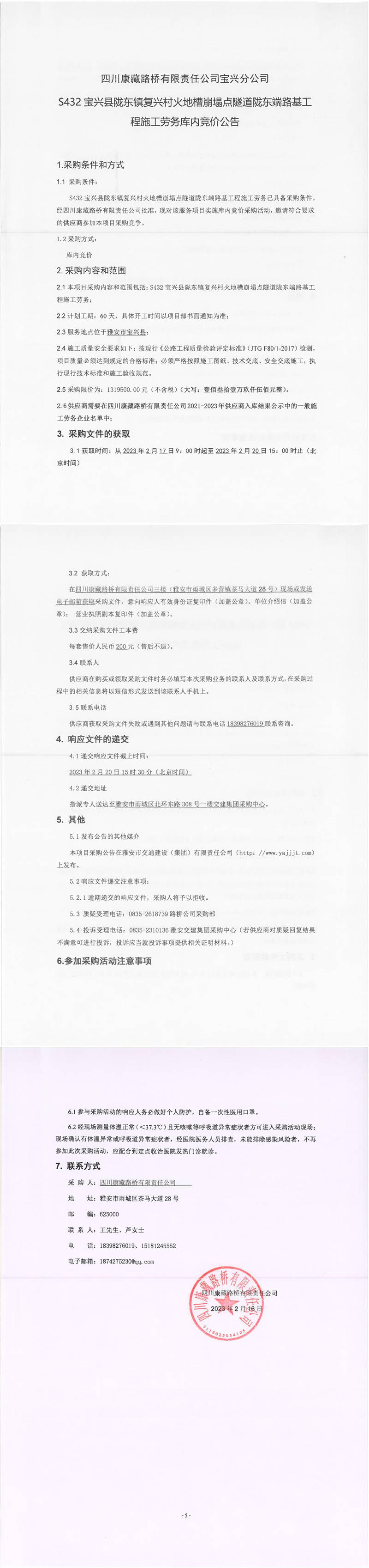 四川康藏路橋有限責任公司S432寶興縣隴東鎮(zhèn)復(fù)興村火地槽崩塌點隧道隴東端路基工程施工勞務(wù)庫內(nèi)競價公告