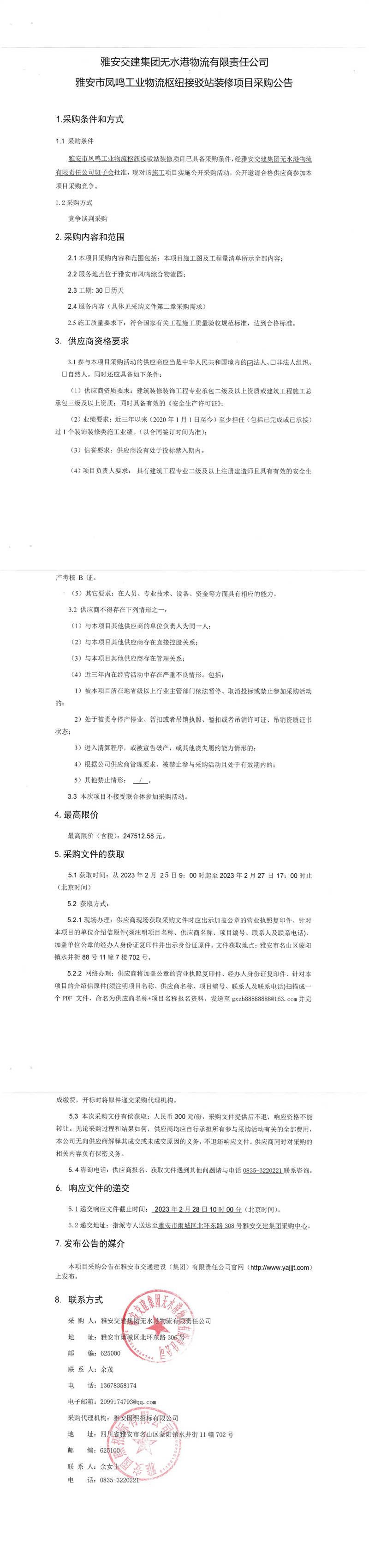 雅安交建集團無水港物流有限責(zé)任公司雅安市鳳鳴工業(yè)物流樞紐接駁站裝修項目采購公告
